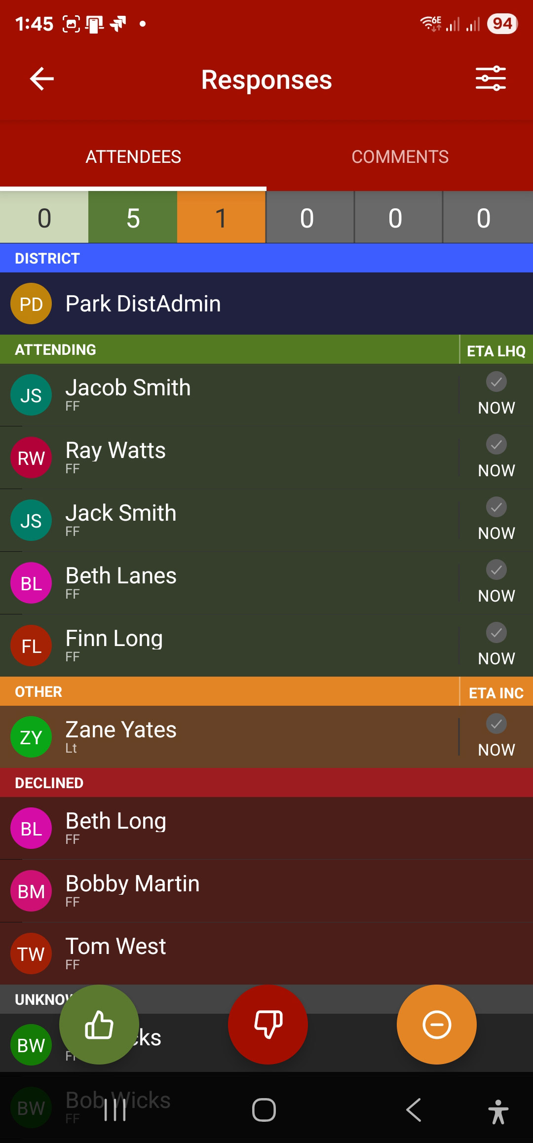 On the Attendees screen, brigade members will notice a new section labelled District Attending (in blue). This makes it clear when a District Officer is on the way — and gives members the ability to contact them directly if required.